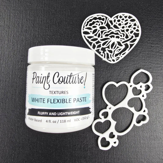 Paint Couture Flexible Paste is a thick, water-based acrylic paste designed to add structure, texture, and dimension to creative projects. This versatile medium dries to a smooth matte finish and offers excellent body, making it ideal for raised designs, stenciling, sculptural details, and mixed media applications. Flexible Paste can be blended with pigments or colorants to create custom colors, giving artists full creative control. Thanks to its elastic, flexible properties, it is also suitable for use in thin molds (3/16" or less in depth), allowing you to create lace-inspired, bendable embellishments that maintain durability.