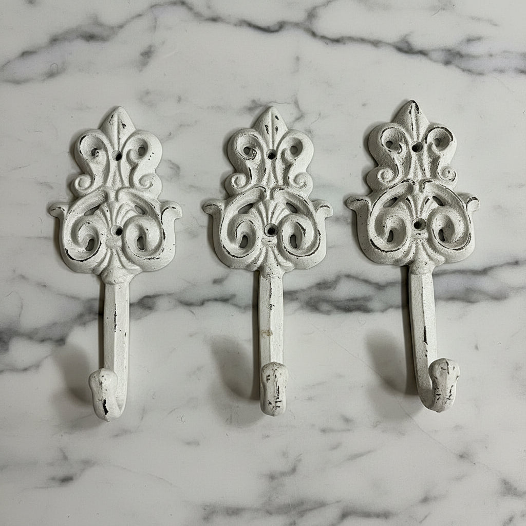 Decorative White Cast Iron Wall Hooks - Set of 3