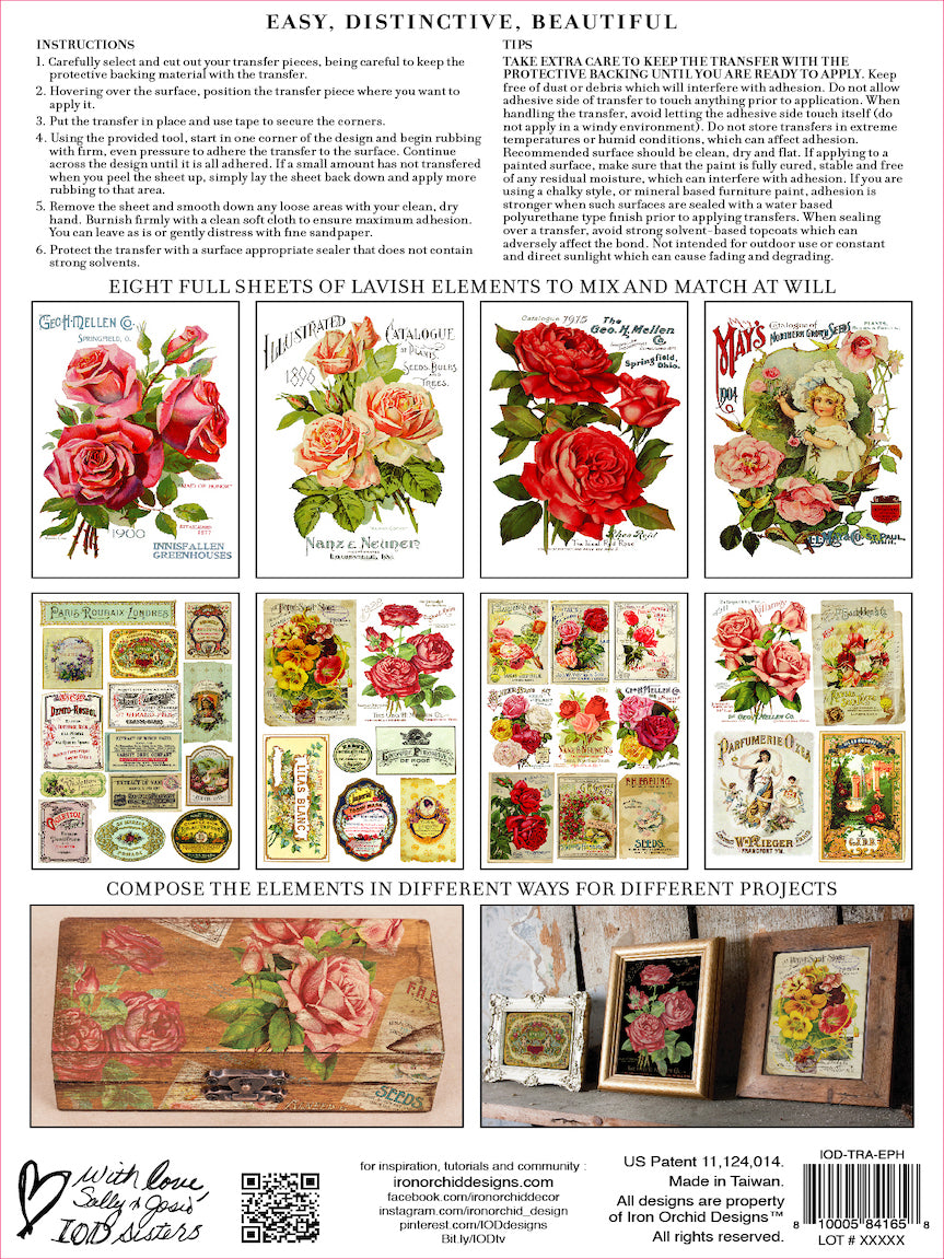 - Application: Pressure sensitive rub on images that adhere to wood, painted furniture, glass, metal, and more